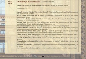 El acto de clausura de la primera jornada fue un homenaje a la carrera académica de Julia Sevilla Muñoz. Para ello se congregaron en una mesa redonda, física y virtualmente, sus compañeros de universidad y sus discípulos. Más de diez investigadores y docentes, algunos de ellos eméritos, vinculados a nueve universidades diferentes, italianas (Università di Roma Tre, Università di Roma «La Sapienza», Università di Messina, SSML Nelson Mandela di Matera) y extranjeras (Universidad Complutense de Madrid, Universidad de San Pertesburgo, Rusia; Universidad Nacional y Kapodistríaca de Atenas, Grecia, Universidad de Ereván, Armenia). Se trató, de todos modos, de una pequeña muestra del enorme alcalce de la influencia y de la proyección internacional de Julia Sevilla Muñoz, de su papel fundamental en la formación de grupos de investigación así como en la formación de jóvenes investigadores. A ella dediqué un pequeño escrito que no se llegó a publicar pero del que me gustaría dejar constancia. ¡Si soy la que soy se lo debo a Julia Sevilla, mi maestra!